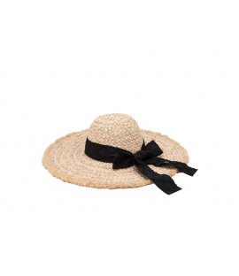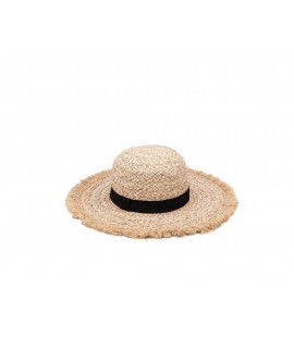 Breitkrempiger Raffiahut mit ausgefranster Krempe. Vorhandensein eines umlaufenden Stoffstreifens. -