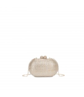 Einteilige Basttasche mit Klickverschluss und dünnem Metallkettenriemen. -