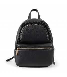 Kunstlederrucksack mit zwei Fächern und Reißverschluss. Vorhandensein von Gewebe auf der Vorderseite und Ton-in-Ton farbigen Strasssteinen. -