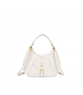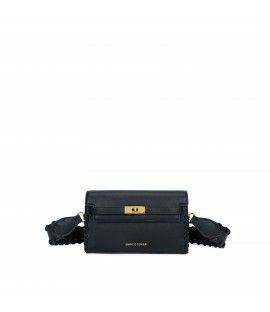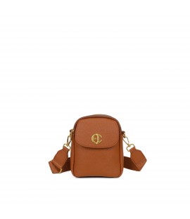 Kleine Umhängetasche aus Kunstleder mit doppeltem Fach und goldenem Metalllogo auf der Klappe. Marken-Schulterriemen aus Stoff, verstellbar und abnehmbar. -