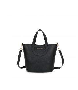 Kunstleder Eimertasche mit einer Kupplung innen. Ausgestattet mit einem Schulterriemen. Anwesenheit von Schriftzug auf der Vorderseite. -