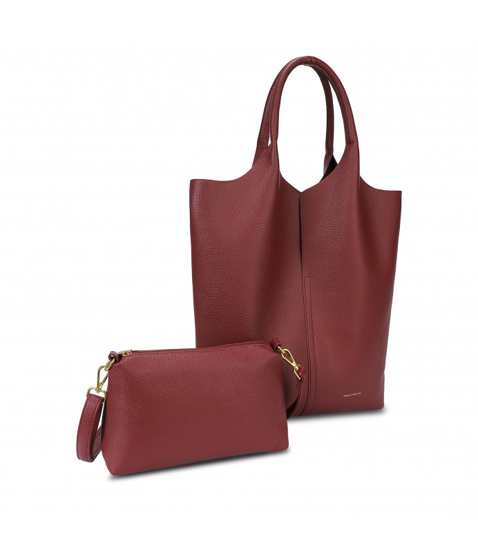 Umhängetasche aus Kunstleder mit Knopfverschluss. Im Inneren befindet sich eine Clutch-Tasche mit Haken an den Seiten der Tasche zu befestigen.