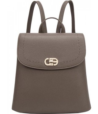 Rucksack aus Kunstleder mit Patte und doppeltem Drehverschluss und Reißverschluss darunter. Im Inneren ist der Raum in zwei Bereiche unterteilt.