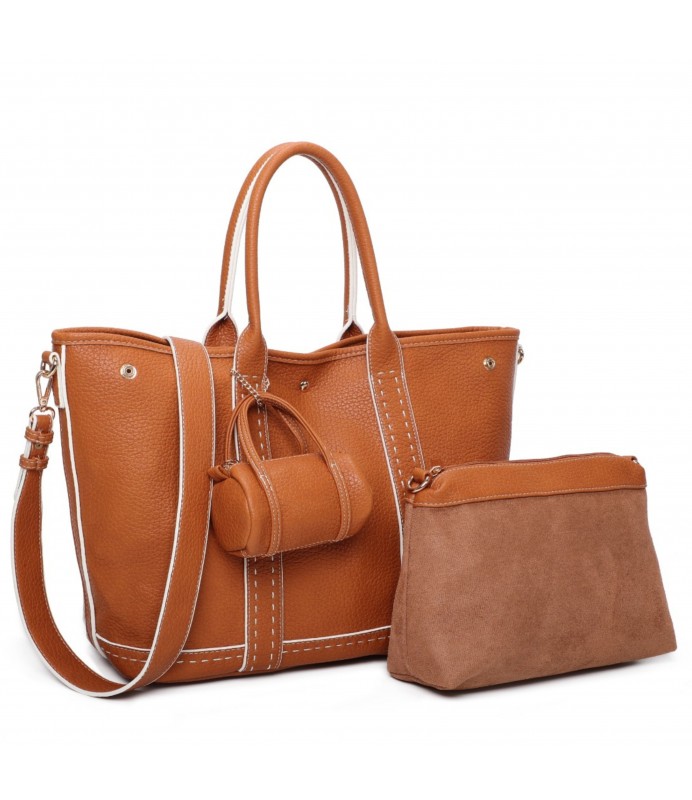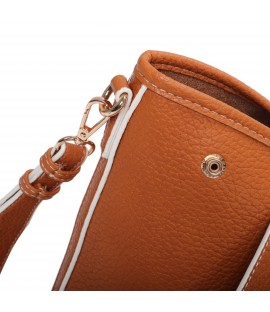 Große Umhängetasche aus kontrastierendem Kunstleder mit einem dünnen, verstellbaren und abnehmbaren Schulterriemen. An der Außenseite befindet sich ein kleines, hängendes Münzfach und an der Innenseite eine kleine, abnehmbare Pochette.