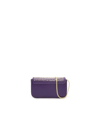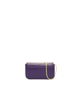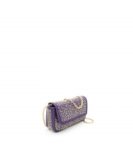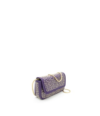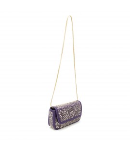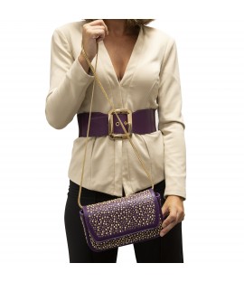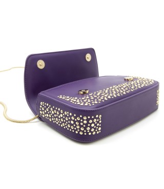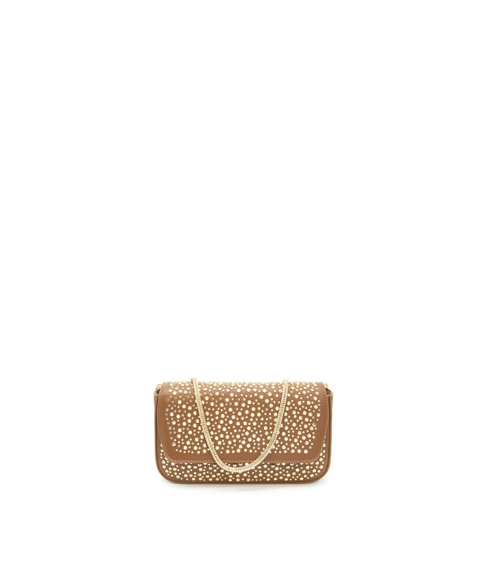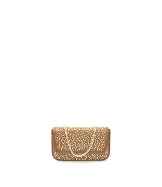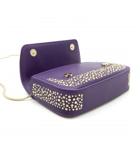 Umhängetasche aus Kunstleder mit kleinen und zahlreichen flachen und konischen Metallnieten in Goldfarbe besetzt.