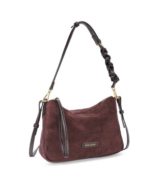 Faux suede bag with a zipper closure. there is a medium-length handle with weave as decoration and an adjustable shoulder strap.