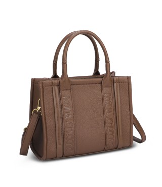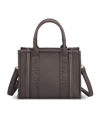 Small hand bag with printed brand name on the front latro. Adjustable shoulder strap present. Zipper closure.