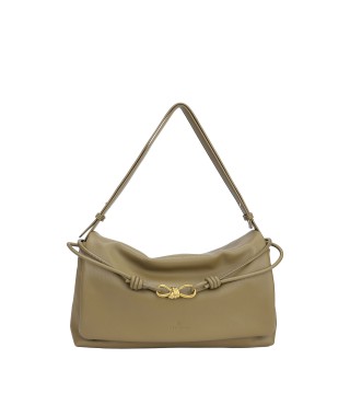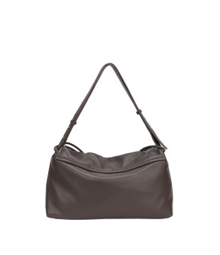 Faux leather bag with flap and double magnetic closure and zip. It has a large adjustable handle.
