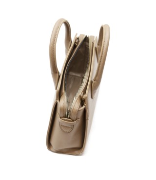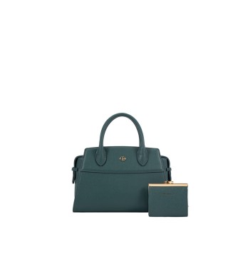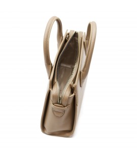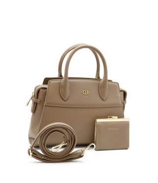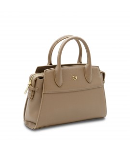 Solid-color handbag with metal brand logo in the front; there are two exterior side zippers that give the bag more capacity. Features a removable shoulder strap and a coin purse with snap closure.