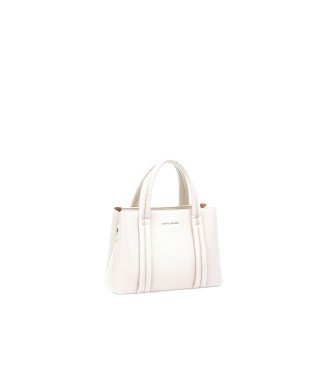 Leatherette handbag featuring a shoulder strap with lettering on the front.