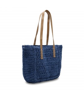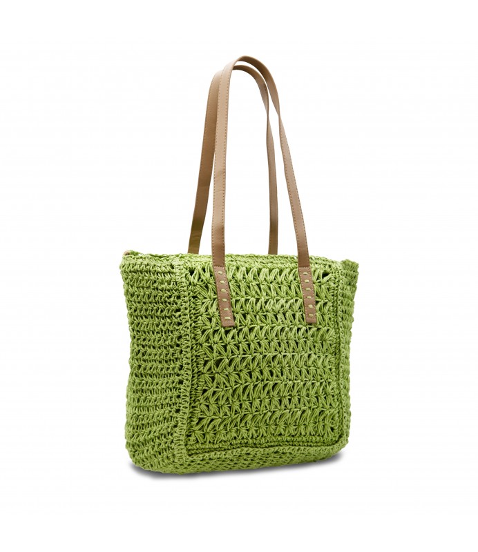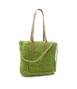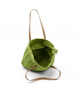 Solid-coloured shoulder bag in natural woven material, with imitation leather handles. Equipped with a detachable shoulder strap. The bag is closed by a zip. The lined interior features a zipped pocket.