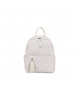 Fabric backpack bag with leatherette details. Single zippered compartment and two pockets on front. -