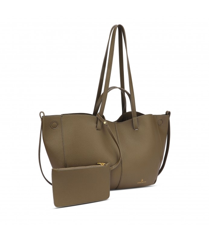 Bolsa de la compra de piel sintética con cierre magnético. Tiene dos asas cortas y dos asas largas. También tiene una práctica bolsa que se cierra con cremallera.