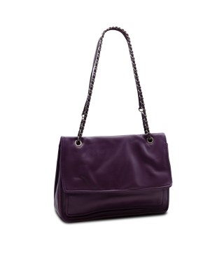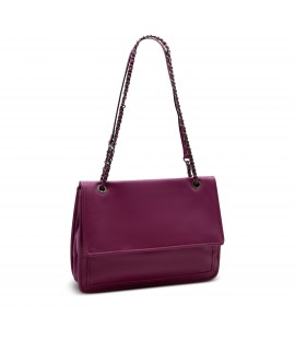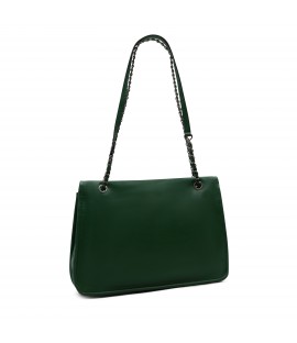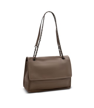 Bolso de polipiel de color liso con un bolsillo en la parte delantera oculto por la solapa de cierre donde hay dos botones de clip. El interior está forrado y dispone de dos pequeños bolsillos sin cierre. Equipado con una bandolera de cadena y polipiel. Fabricado en China.
