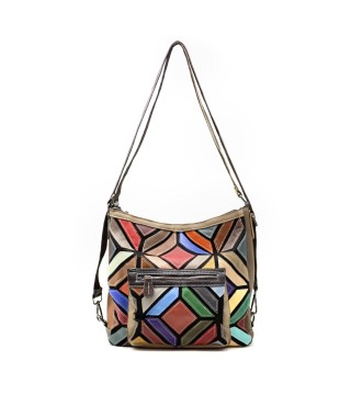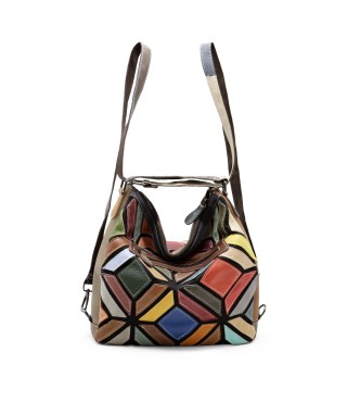 Bolso bandolera patchwork multicolor de piel auténtica para mujer, con un diseño que también puede utilizarse en formato mochila.