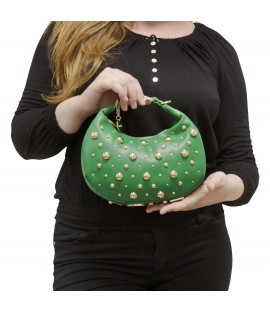 Bolso de mano de polipiel con tachuelas metálicas doradas en la parte delantera e inscripción "LOVE" en la base. Con bandolera extraíble y cierre de cremallera.