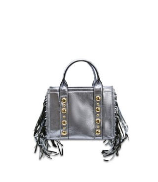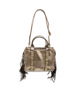 Bolso mediano en polipiel laminada con flecos. Consta de un único compartimento con cremallera y una correa para el hombro.