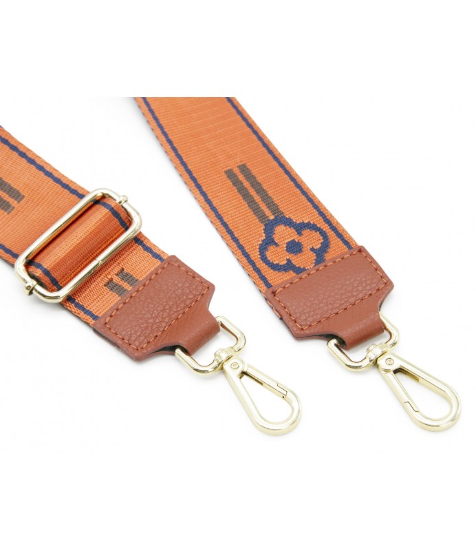 Bandolera para bolsos, en tejido con piel genuina y detalles en metal dorado.