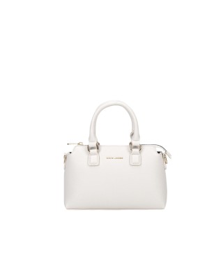 Pequeño bolso bowling en imitación de cuero que consta de un único compartimento con cremallera. Presencia de letras en la parte delantera.
