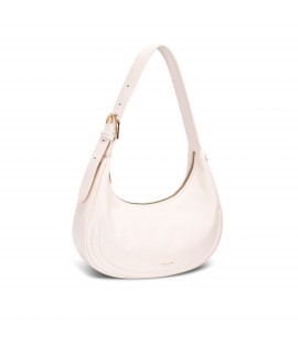 Bolso bandolera de media luna en polipiel de color sólido. Compartimento único con cremallera. Asa con hebilla ajustable. Letras en la parte delantera.
