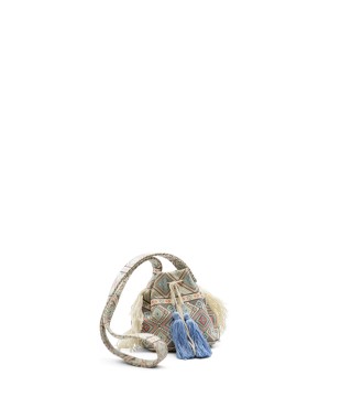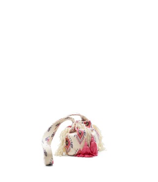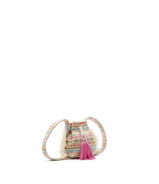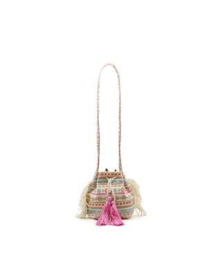 Bolso cubo de tela con varios estampados y bonitos flecos en los laterales. en el interior un único espacio. Presenta una única asa larga y cierre de cordón. Ausencia de logotipo y letras.