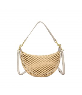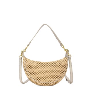 Bolso de media luna de rafia con detalles de polipiel. Asa y bandolera desmontables. Un solo compartimento con cremallera.