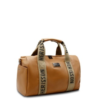 Bolso de viaje Herisson para hombre y mujer en polipiel con un bolsillo en la parte trasera con cierre de cremallera y dos bolsillos laterales sin cierre. El interior está forrado y tiene un bolsillo con cremallera. Hay dos ribetes de tela de distintos colores que siguen la línea del bolso donde está inscrita la marca Herisson y dan la forma de las asas, que están reforzadas con una parte de polipiel. El bolso se cierra con una cremallera doble y tiene también una bandolera desmontable del mismo color que los perfiles de la marca.