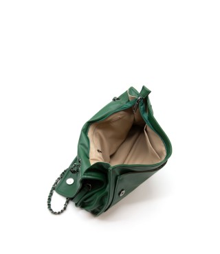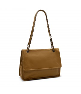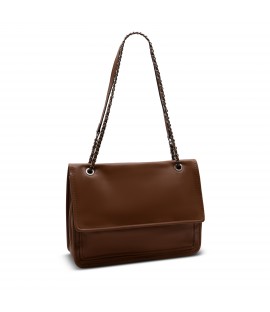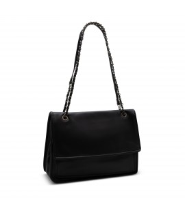 Sac en simili-cuir de couleur unie avec une poche sur le devant cachée par le rabat de fermeture où se trouvent deux boutons à clipser. L'intérieur est doublé et comporte deux petites poches sans fermeture. Équipé d'une bandoulière en chaîne et en simili-cuir. Fabriqué en Chine.