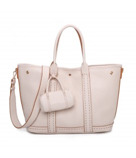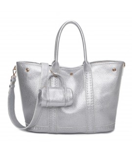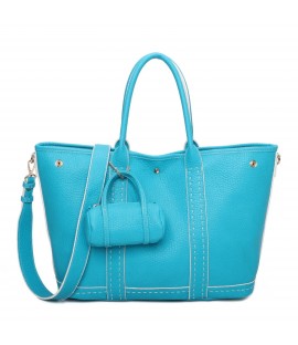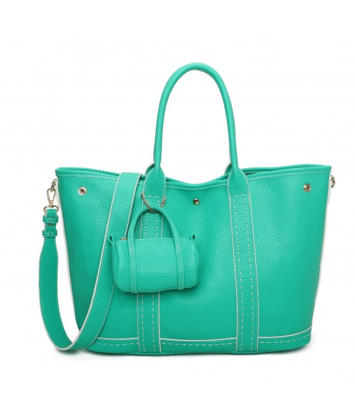 Grand sac à bandoulière en simili-cuir contrasté, doté d'une fine bandoulière réglable et amovible. Présence d'un petit porte-monnaie suspendu à l'extérieur et d'une petite pochette détachable à l'intérieur.
