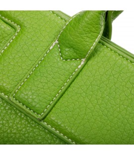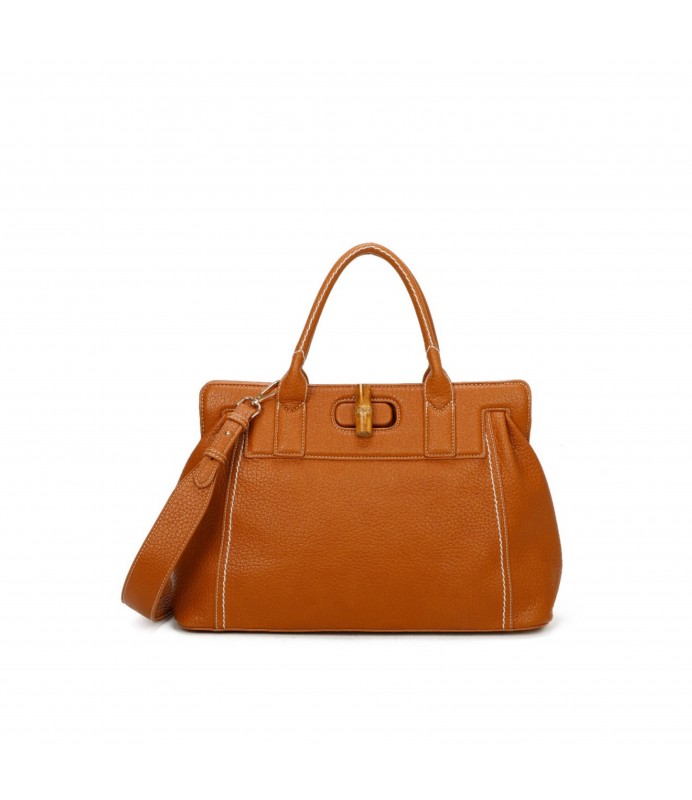 Grand sac à bandoulière en simili-cuir avec bordure contrastée et fermeture pivotante en bambou. Équipé d'une bandoulière réglable et amovible.