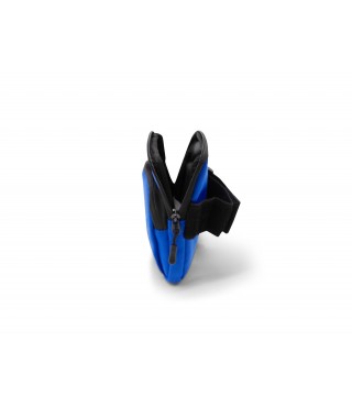 Étui pour téléphone portable de couleur unie avec bordure noire. Deux poches zippées de tailles différentes sur le devant et une bande élastique réglable sur le dos.