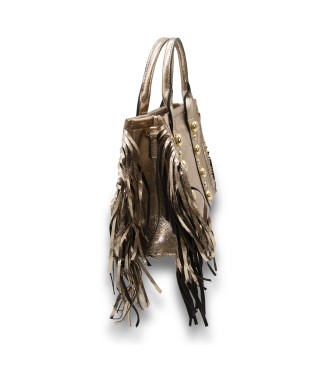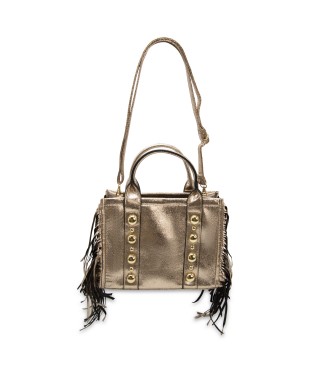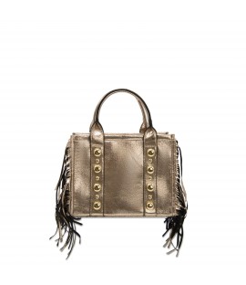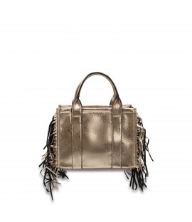 Sac à main de taille moyenne en simili-cuir laminé avec franges. Composé d'un seul compartiment zippé et d'une bandoulière.