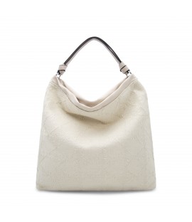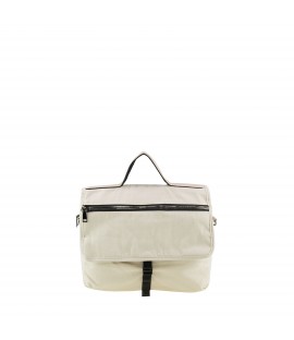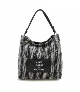 Sac hobo en tissu avec détails en similicuir et écriture sur le devant. Équipé d'une bandoulière amovible.