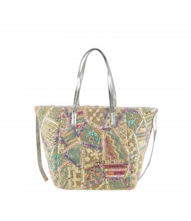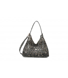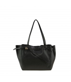 Sac hobo en simili cuir avec fermeture à glissière. Il est doté d'une longue poignée et d'une bandoulière amovible. À l'intérieur, on trouve une pochette avec fermeture à glissière. La décoration métallique dorée sur le devant rappelle les finitions de la bandoulière et de la fermeture à glissière.
