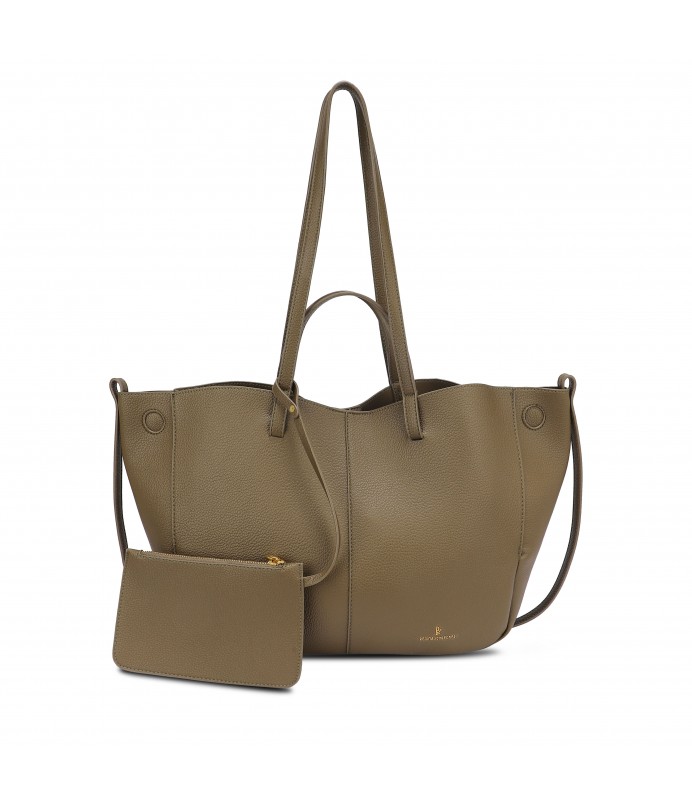 Shopping bag in ecopelle con chiusura magnetica. Sono presenti due manici corti e due manici lunghi. Troviamo anche una comoda bustina da allegare con chiusura a zip.
