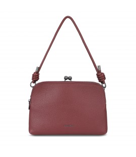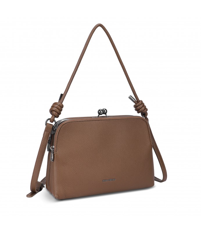Borsa in ecopelle a tre scomparti due con chiusura a zip e uno centrale con la chiusura clic clac. Presente un manico di media lunghezza e una tracolla regolabile.