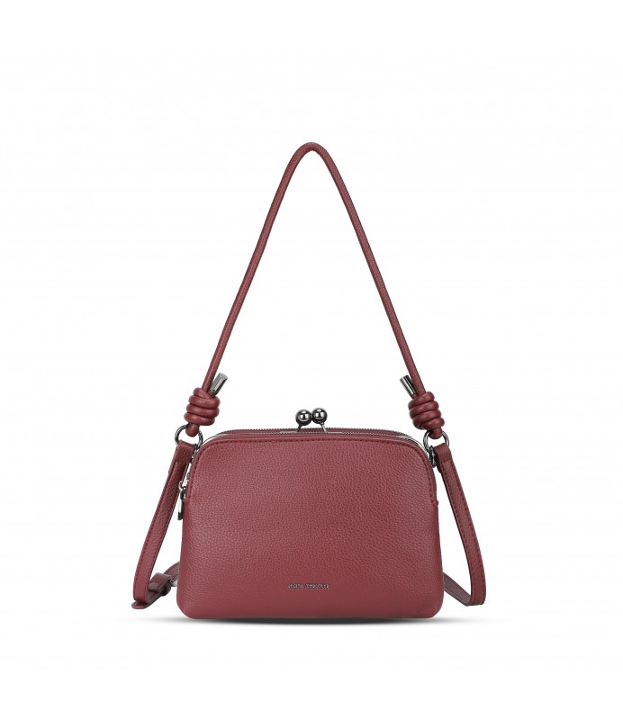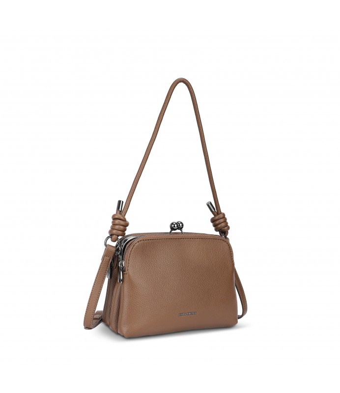 Borsa in ecopelle a tre scomparti due con chiusura a zip e uno centrale con la chiusura clic clac. Presente un manico di media lunghezza e una tracolla regolabile.
