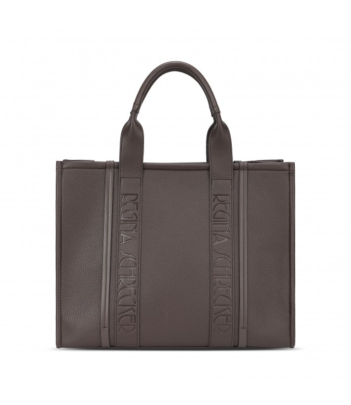 Borsa a mano in ecopelle dotata di tracolla con il marchio regina schrecker stampato sul lato frontale. Chiusura a zip.