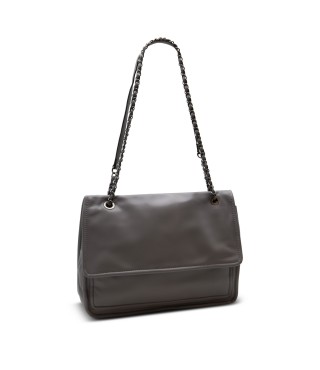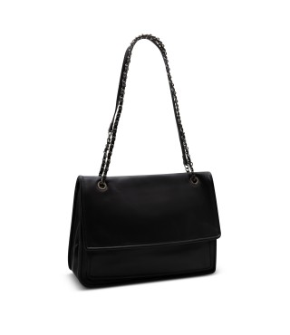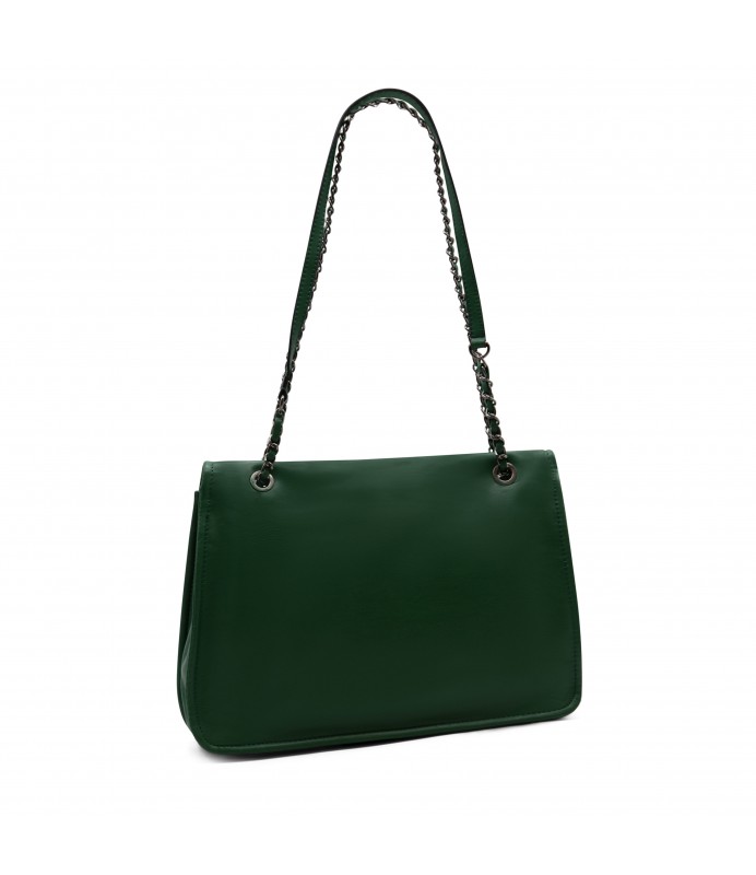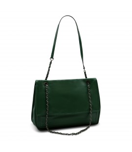 Borsa in similpelle in tinta unita con tasca sul davanti nascosta dalla patta di chiusura dove vi sono due bottoni a clip. L'interno è foderato e presenta due taschini senza chiusura. Dotata di tracolla a catena e in similpelle. Made in Cina.