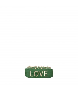 Borsa a mano in similpelle con borchie in metallo colore oro sul fronte e inserto "LOVE" sulla base. Composta di tracolla removibile e chiusura lampo.