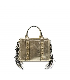 Borsa a mano di media dimensione in similpelle laminata con le frange. Composta di un singolo scomparto con cerniera e di una tracolla.