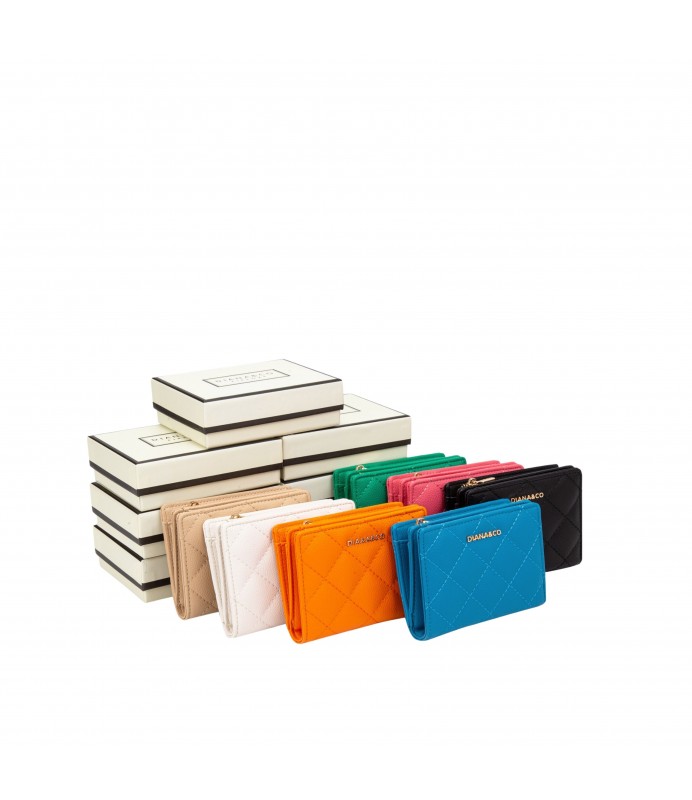 Portafoglio piccolo trapuntato in similpelle con lettering in metallo oro sul fronte.