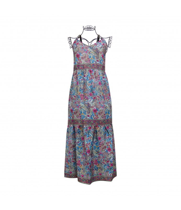 Long beach dress with light blue-fuchsia floral pattern