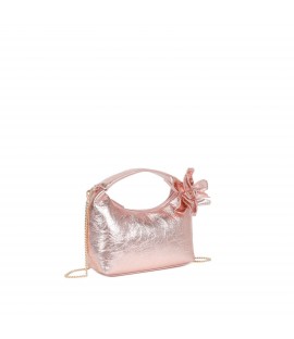 Borsa a mano in similpelle laminata con fiore tridimensionale sul manico. Singolo scomparto con cerniera. Presenza di una tracolla a catena in metallo colore oro.