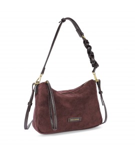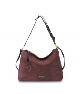 Borsa in simil camoscio con chiusura a zip. è presente un manico di media lunghezza con intreccio decorativo e uuna tracolla regolabile. -
