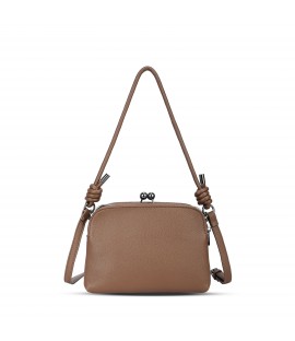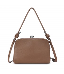 Borsa in ecopelle con pattina e chiusura a girello. All'interno a due scomparti divisi da una bustina centrale con chiusura a zip. Tracolla regolabile in metallo e pu. -