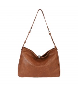 Borsa a spalla in ecopelle con chiusura a zip. Ha un manico lungo regolabile e decoro in corda. -